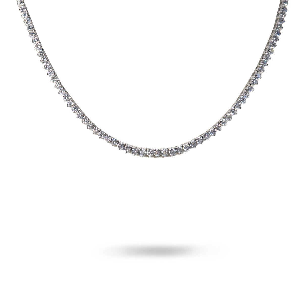 -Round brilliant lab grown diamonds 11.88TCW DE/VVS2-VS1 -14 karat white gold -High polish finish -Secure push button clasp and safety latch -Measures 18 inches in length and can be custom made to order in any size -Style code: N990