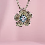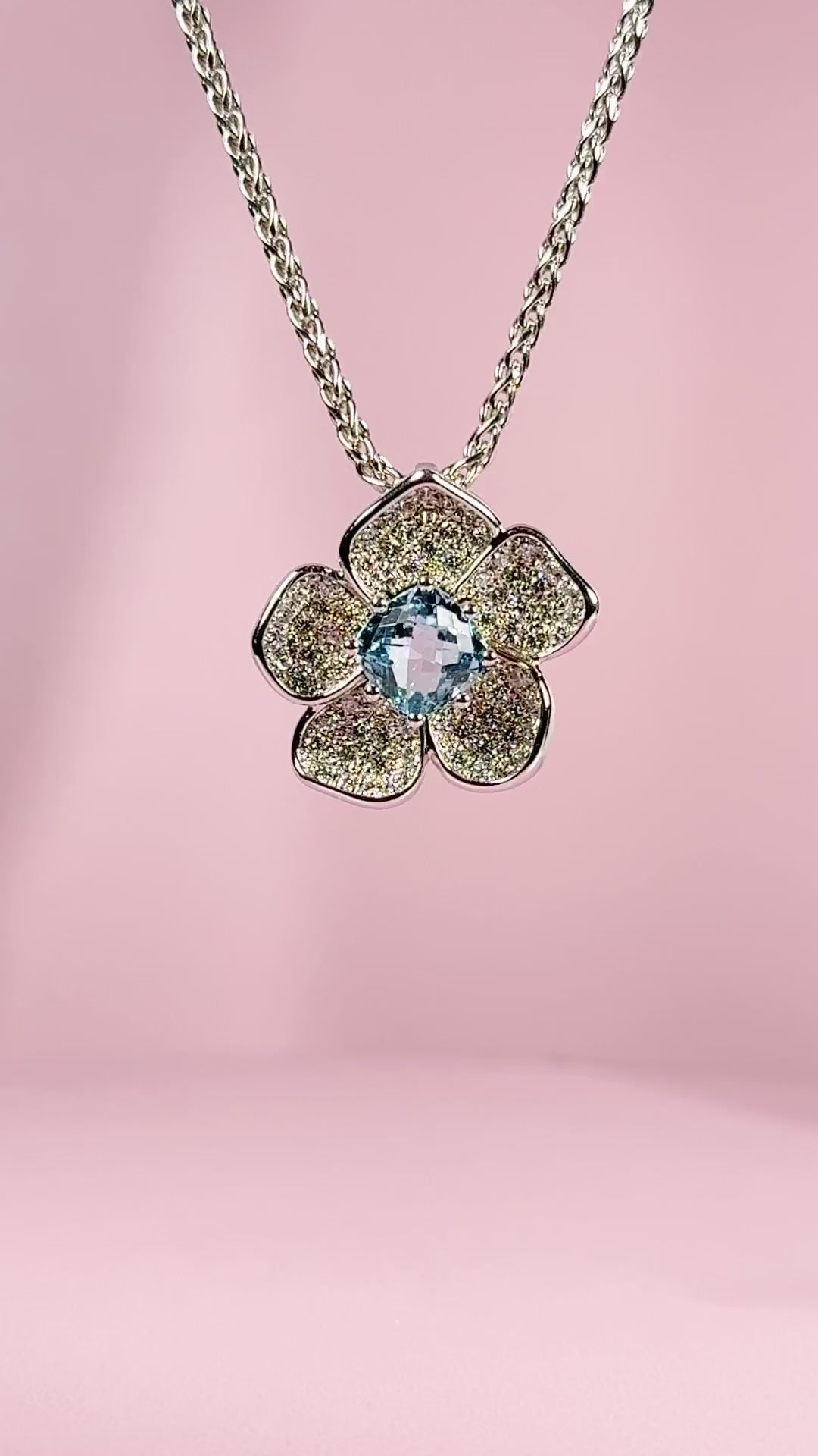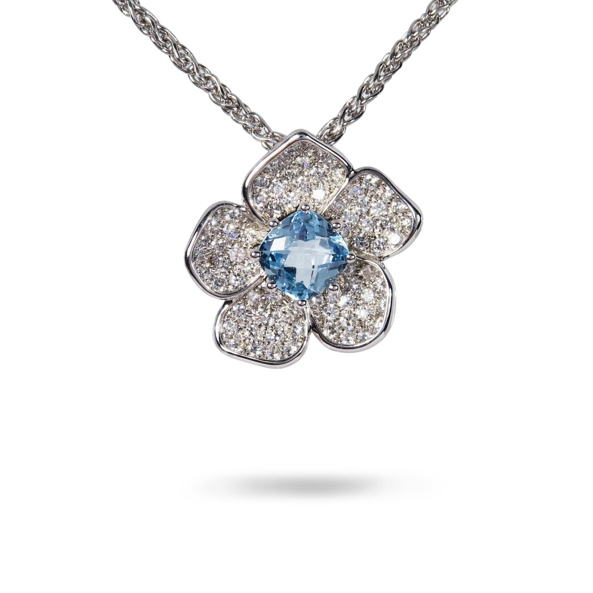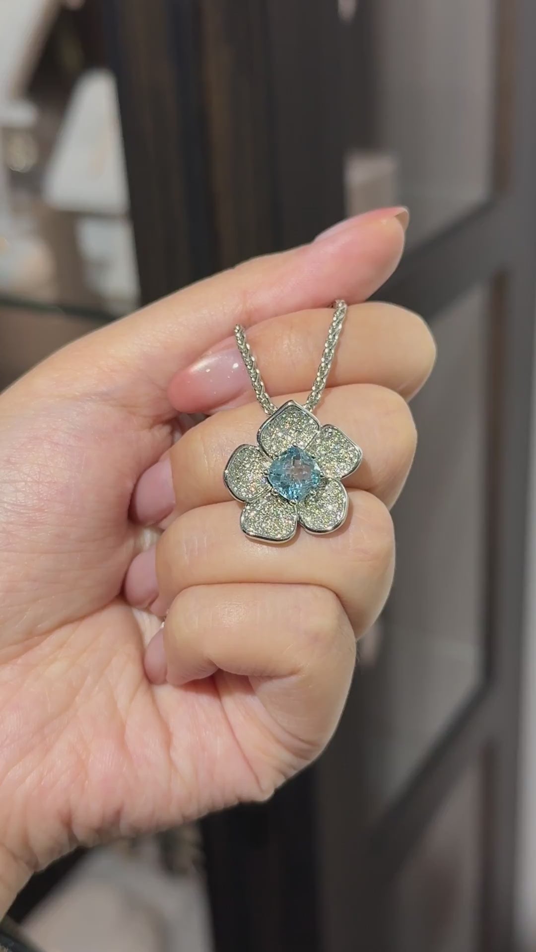 Graceful and radiant, this custom necklace features a floral pendant crafted in 14K white gold. At its center blooms a cushion-cut blue topaz, surrounded by five shimmering diamond pavé petals that catch the light from every angle. A perfect blend of softness and sparkle, this piece brings a fresh, elegant touch to any jewellery collection.