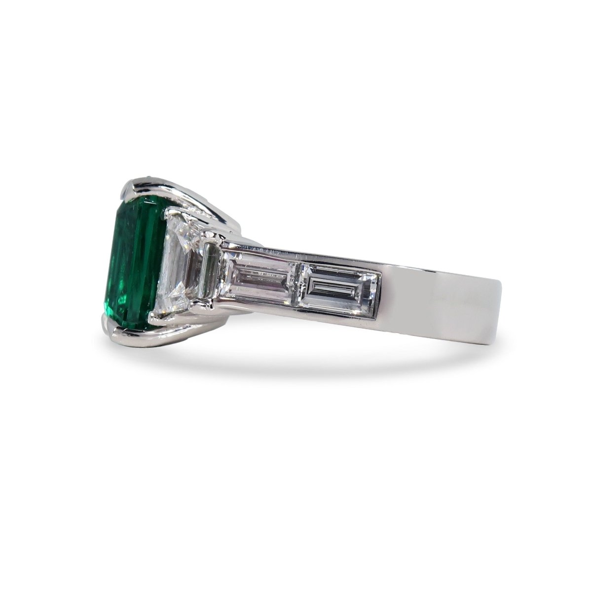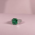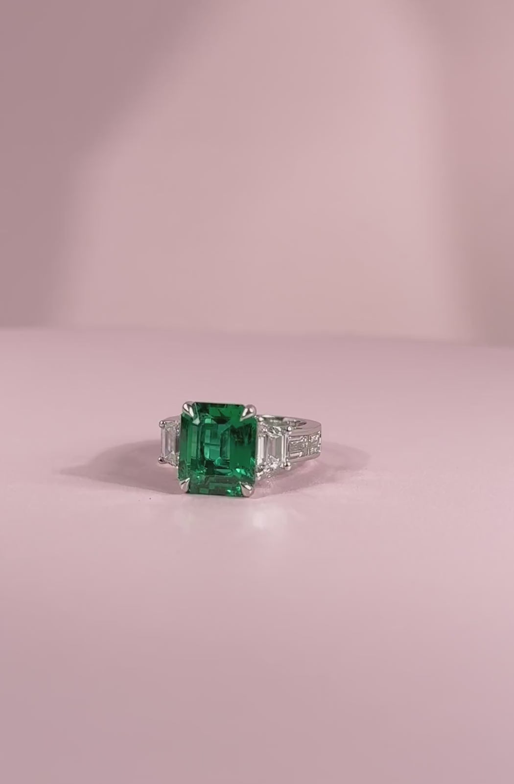 Celebrate timeless love with this platinum anniversary ring, showcasing a vibrant emerald-cut emerald at the center, framed by sparkling trapezoid and baguette-cut diamonds. Hidden ruby baguettes beneath the setting add a meaningful pop of color, symbolizing passion and enduring commitment. A sophisticated design with thoughtful details, perfect for marking a special milestone.